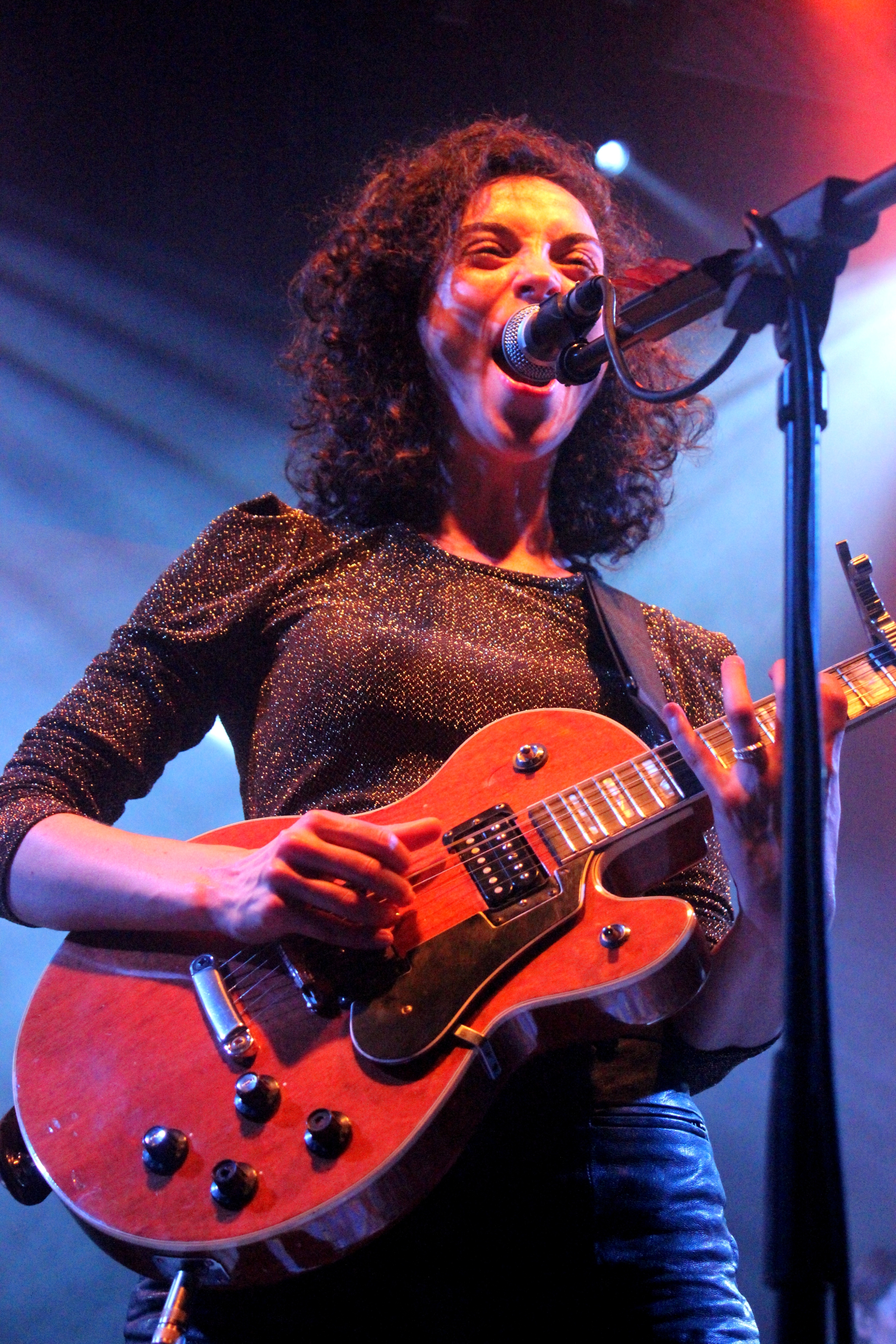 No sé dónde los mete, pero esta chica tan finita se zampa los escenarios. Allí arriba transforma esa carita de buena chica, mansa y sencilla, en un semblante y una pose de fiereza, garra y ahínco, con arranques igualmente intensos de dulzura y contracción. Anoche cabía, y muy bien, su sonido en la Sala Apolo; también su público, por desgracia, que no la llenó. Pero ella no cabía ni de lejos: como Daryl Hannah en Attack of the 50 Ft. Woman, Annie Clark sobresalía de las instalaciones, y quedaron los asistentes en las primeras filas, a los pies de unas quilométricas piernas que no parecían tener fin. Solo que desde la cima de su grandeza, delicada y estirada, salían chispazos punzantes de pop-rock refinado y erizado.