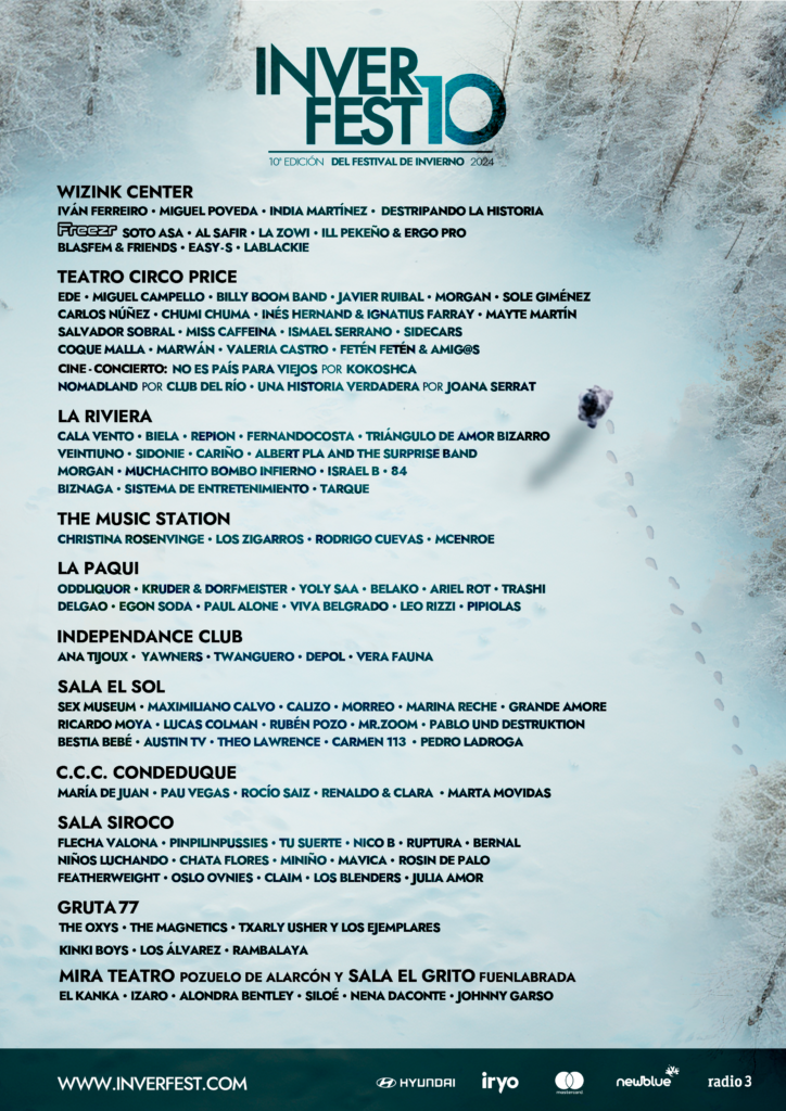 Cuenta atrás para el décimo aniversario de Inverfest. El ya emblemático festival de invierno de Madrid presentó anoche su cartel completo en una fiesta especial en la sala La Riviera. Todo ello en una noche en la que se desveló la extensa programación de Inverfest 2024, que ofrecerá 120 conciertos en 13 recintos y salas de Madrid, Pozuelo de Alarcón y Fuenlabrada, de las cuales este año se estrenan en el ciclo The Music Station e Independance Club.