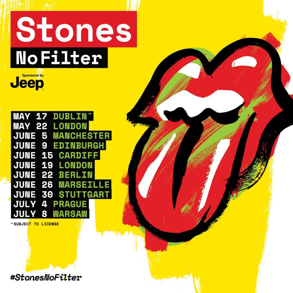 La legendaria banda anuncia un nuevo tour que, por el momento, sólo tendrá fechas en suelo europeo. Así, la banda iniciará con un show en Dublín, Irlanda, el próximo 17 de mayo, y concluirá el 8 de julio en Varsovia, Polonia. Las fechas de Stones NO Filter son las siguientes: