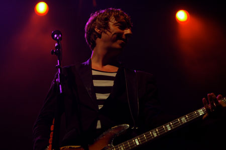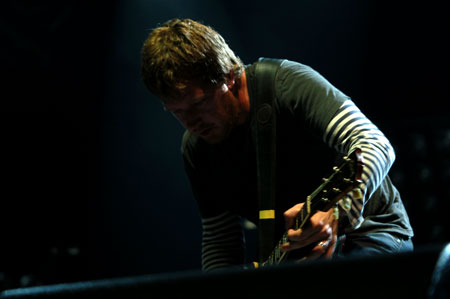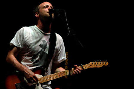 El comienzo del concierto fue muy grande. En primer lugar por la parafernalia inicial, muy espectacular, con cuatro luces de mano enfocando a los presentes mientras sonaban los créditos iniciales de la 20th Century Fox y el principio de la banda sonora de Rocky. Y es que Travis entraban al escenario desde el final de la sala, atravesando a todo el público hasta llegar al escenario. La llegada de los rockeros boxeadores (así fue como lo pensé en ese momento) significó una manera realmente distinta de empezar un show. El primer tema fue Selfish jean, de su último álbum, seguido de Eyes wide open. Este nuevo disco, titulado The boy with no name (Epic, 2007), resulta ser una buena colección de canciones pop muy bien elaboradas y cuidadas. Pero no solo escuchamos composiciones de éste, sino que en alrededor de hora y media tuvimos la suerte de poder escuchar unas dieciocho canciones que repasaron toda la discografía de Travis. Ese fue el caso de Writing to reach you (uno de los temas que más me gustan de ellos y por el que les descubrí). Sonó muy bien, y sobretodo hay que hacer mención especial a Andy, guitarrista que en todas las canciones saca el máximo potencial de su eléctrica (pedales de efectos incluidos). De ese mismo disco también tuvimos la suerte de escuchar la tranquila As you are. Después vino My eyes, que el público reconoció y cantó la parte del «Ya ya ya ya». A continuación vino el turno de otro hit del grupo como es Driftwood, en el que Douglas no paraba de poner caras sonriente y lanzar íntimas miradas a Fran Healy.