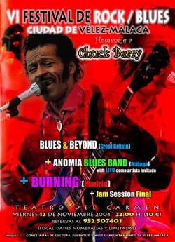 Como cada noviembre desde hace cinco años, se celebró en Vélez-Málaga el Festival de Rock & Blues. Por esta interesante cita anual han pasado artistas como Lito Blues Band, Peter Edgerton, Free Soul Band, Richard Ray Farrell o Tabletom. Cada edición está dedicada a figuras imprescindibles del mundo del rock. Si durante estos cuatro años se ha rendido homenaje a George Harrison, los Rolling Stones, Jimi Hendrix y Janis Joplin, en este 2004 se ha optado por Eric Clapton y Chuck Berry. Manolenta fue el escogido para la antesala del festival (celebrada el 4 de junio) y en la que participaron Racket, Smiling Jack Smith y los malagueños Gargante Profunda. Chuck Berry fue el principal homenajeado en esta ocasión.